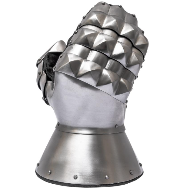 Hourglass mittens are a unique and stylish type of medieval hand armor designed to offer both protection and flexibility. Featuring a distinct hourglass silhouette, these mittens provide excellent coverage for the hands and wrists while allowing for comfortable movement. Crafted with attention to historical detail, hourglass mittens were commonly used by knights and soldiers during the late medieval period. Ideal for reenactments, collections, or authentic medieval armor sets, these mittens combine function and aesthetic appeal.