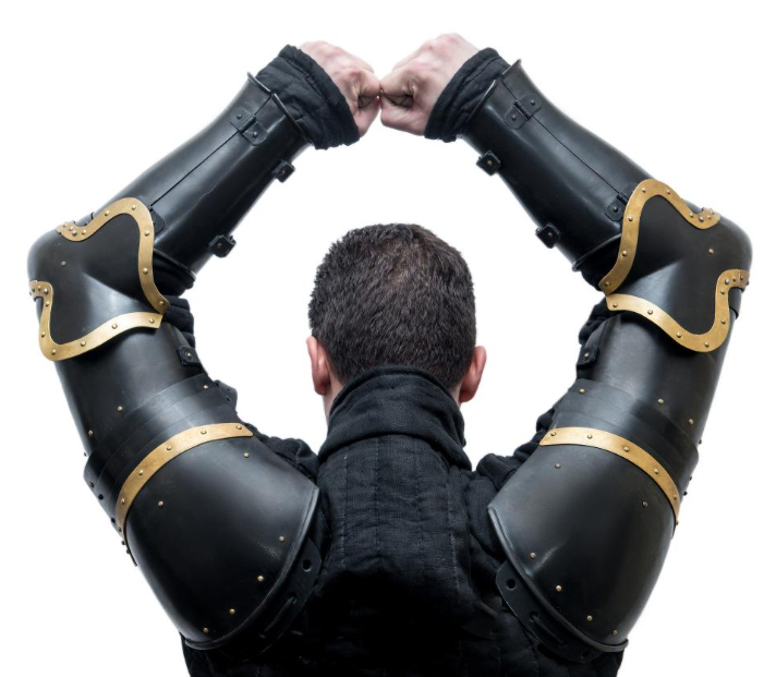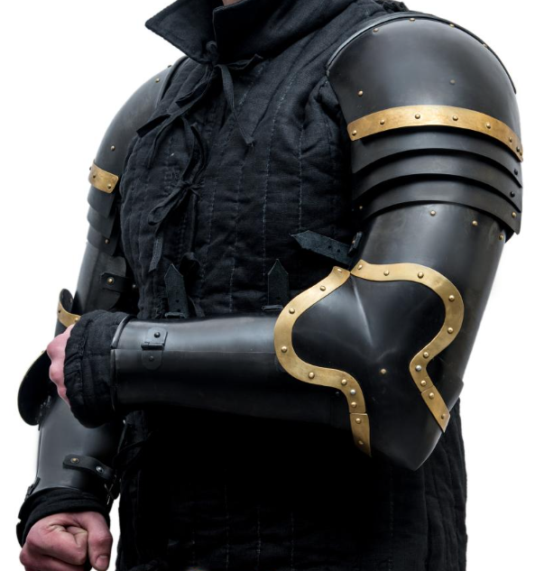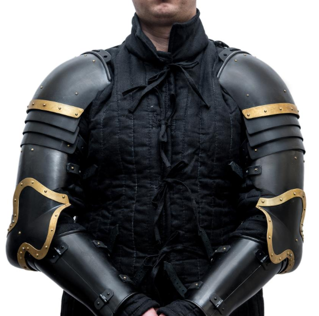 Crafted in the Italian tradition, these dark full plate arms offer robust protection for the upper and lower arms, including articulated elbow cops for flexibility. Perfect for HMB, reenactment, or display, this armor set combines authentic 15th-century design with a sleek dark finish for a bold, battle-ready appearance. Built for both durability and historical accuracy, they are secured with reliable leather straps and buckles.