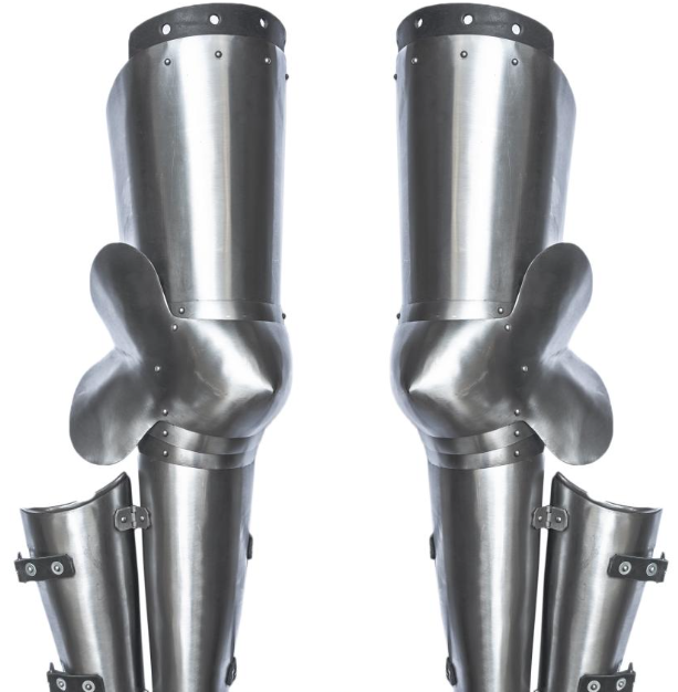 steel would have been carefully tempered and shaped, often from locally refined bloomery or early blast‑furnace iron, fashioned to curve around the contours of a knight’s limb. Leather straps with buckles held the components together, allowing the wearer to flex the elbow and maintain better control without compromising protection.
