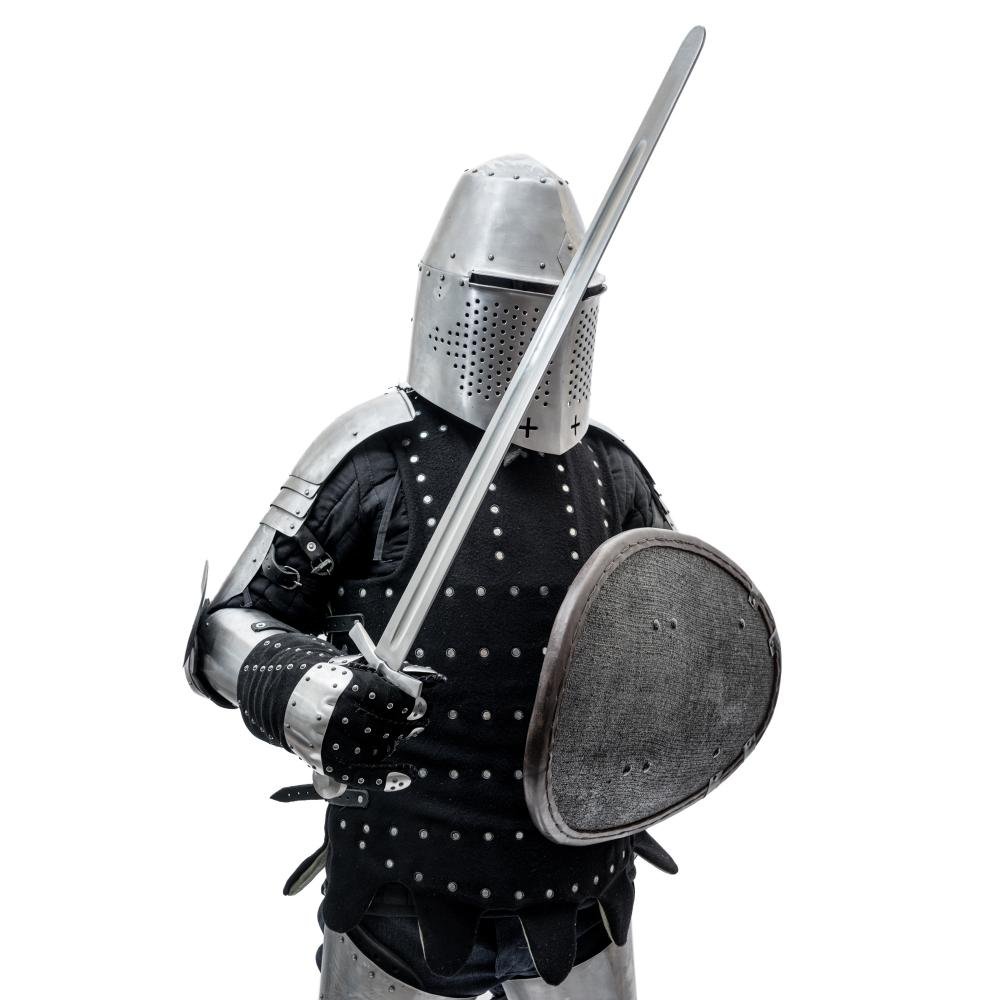 Components: Great Helm, Kusnacht Brigandine, Plate Shoulders, Plate Arms, Visby Gauntlets, Cuisses with Shin Guards