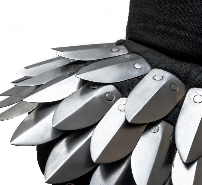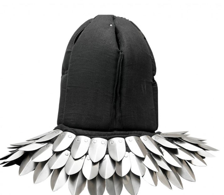 The padded interior offers cushioning against blows, while the layered scale collar provides reinforced defense around the neck and shoulders. Adjustable and breathable, it can be worn under helmets or as a standalone piece. Whether you’re on the battlefield or the stage, this coif is a must-have for any warrior’s kit.