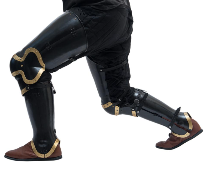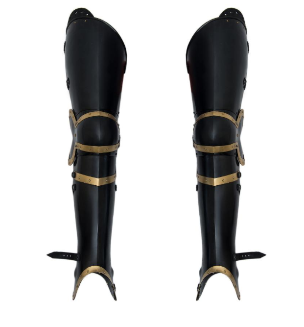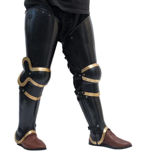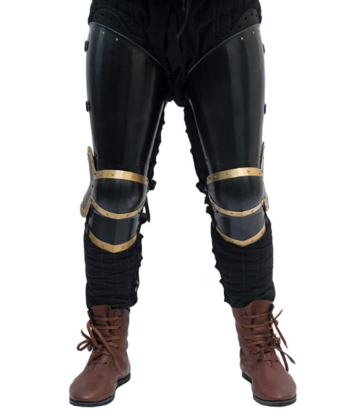 Each plate is forged from premium blackened steel, offering robust protection while the contrasting brass inlays and accents add a touch of regal elegance. Designed for both durability and mobility, these plate legs provide comprehensive coverage for the thighs, knees, and lower legs without sacrificing comfort or flexibility.
