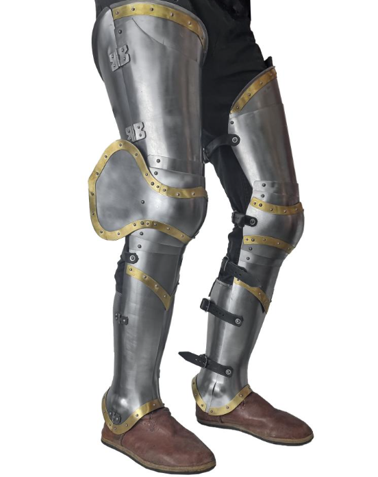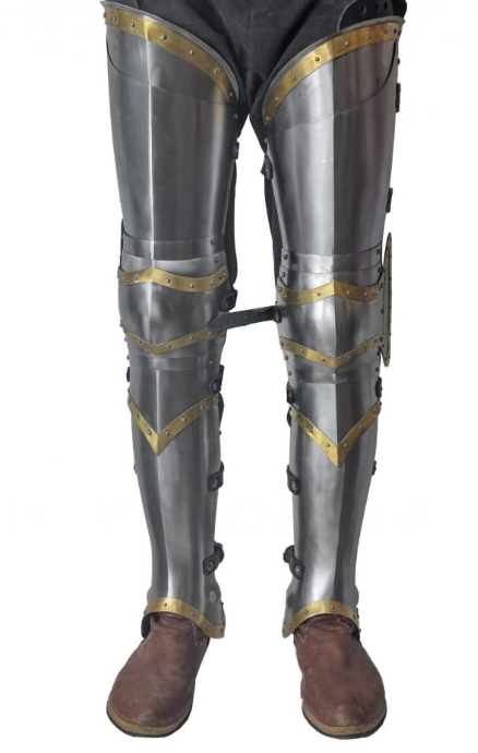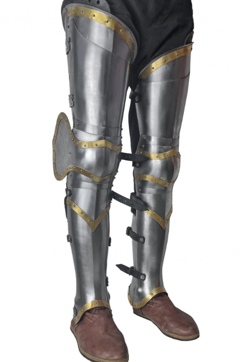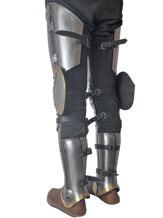 Equipped with adjustable leather straps for a comfortable and secure fit, these plate legs provide reliable protection and freedom of movement. Perfect for reenactment enthusiasts, collectors, and anyone passionate about historical armor, this brass-style tombstone-inspired leg protection is a bold statement piece that honors medieval heritage with a distinctive look.