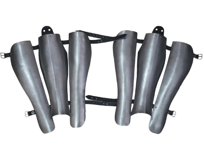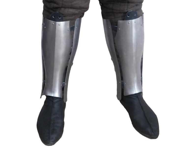 The Three Segments Greaves provide layered, articulated defense designed to protect the wearer’s lower legs with maximum mobility. These greaves feature three overlapping steel plates that work together to shield the shin and calf while allowing natural movement during combat or reenactment.